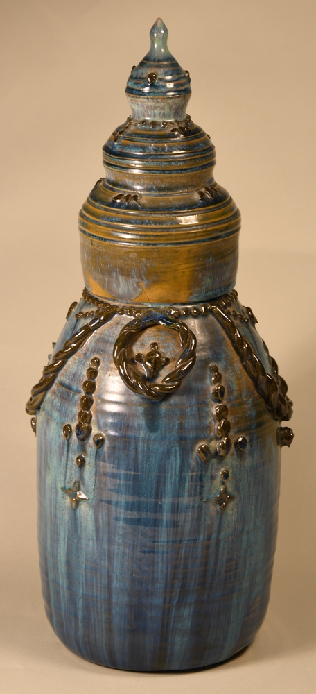 Vaas met deksel van keramiek blauw groen gemaakt doo...