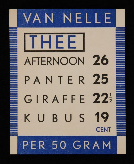 Kleine prijslijst met prijzen Van Nelle's thee, blauw