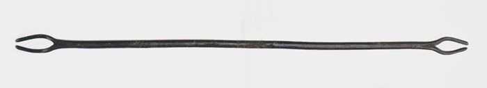 Lange koperen pen met twee open, ovale ogen aan de u...