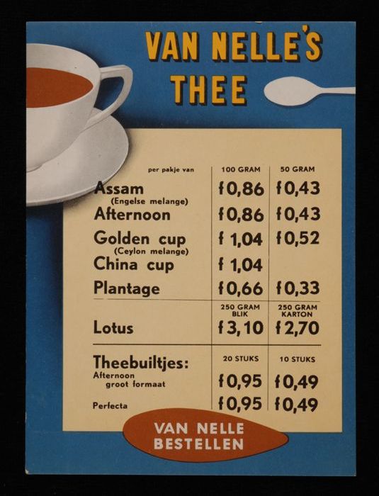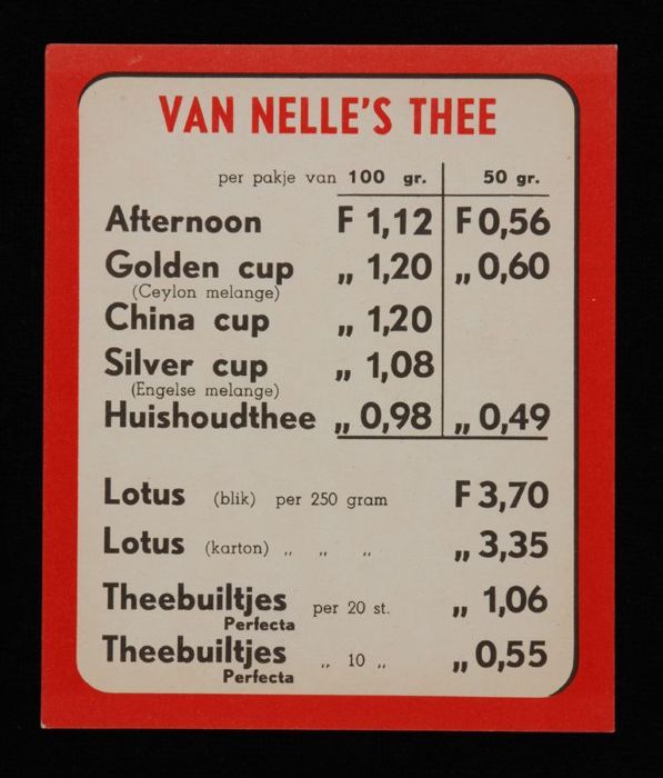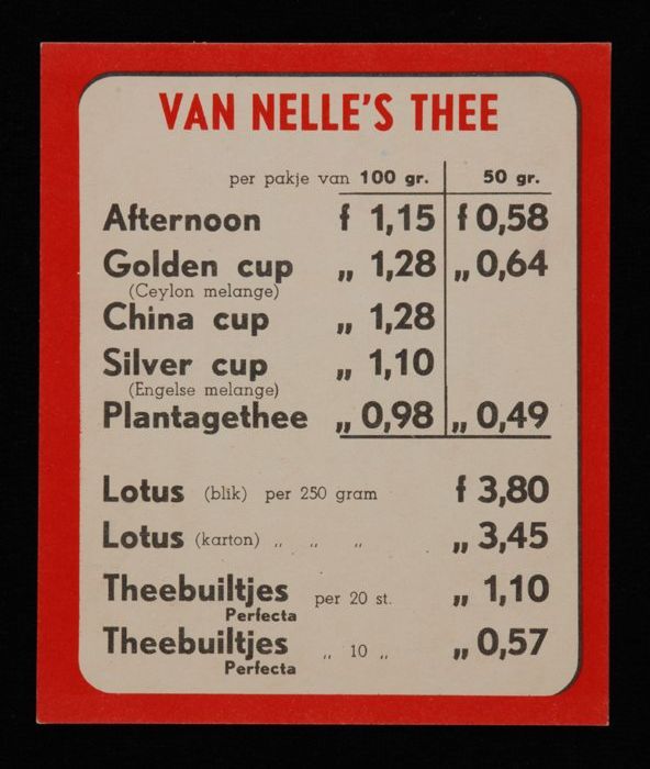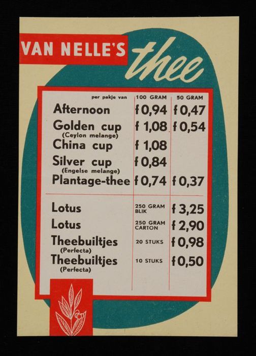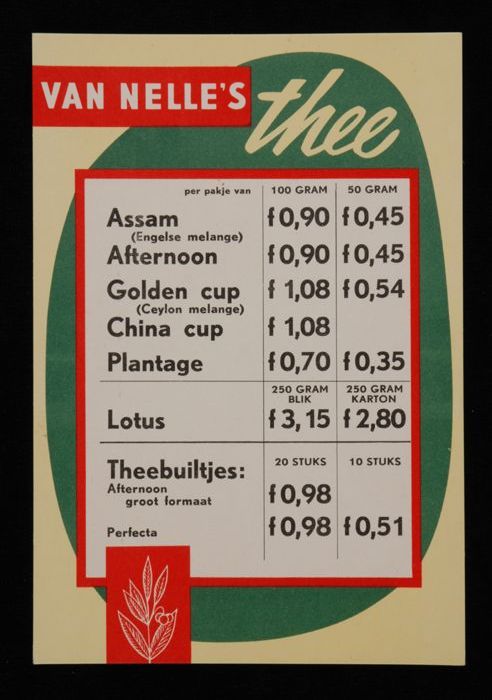 Prijslijst Van Nelle met onder meer "Zet nu beter thee"