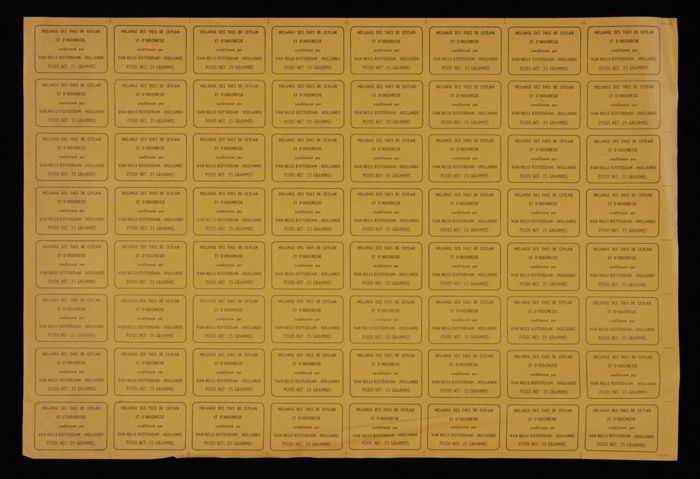 Vel met gedrukte etiketten "MELANGE DE THE DE CEYLAN...