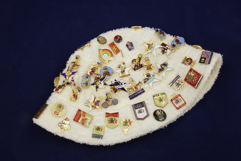 Muts met bijna 100 spelden daarop van de Olympische ...