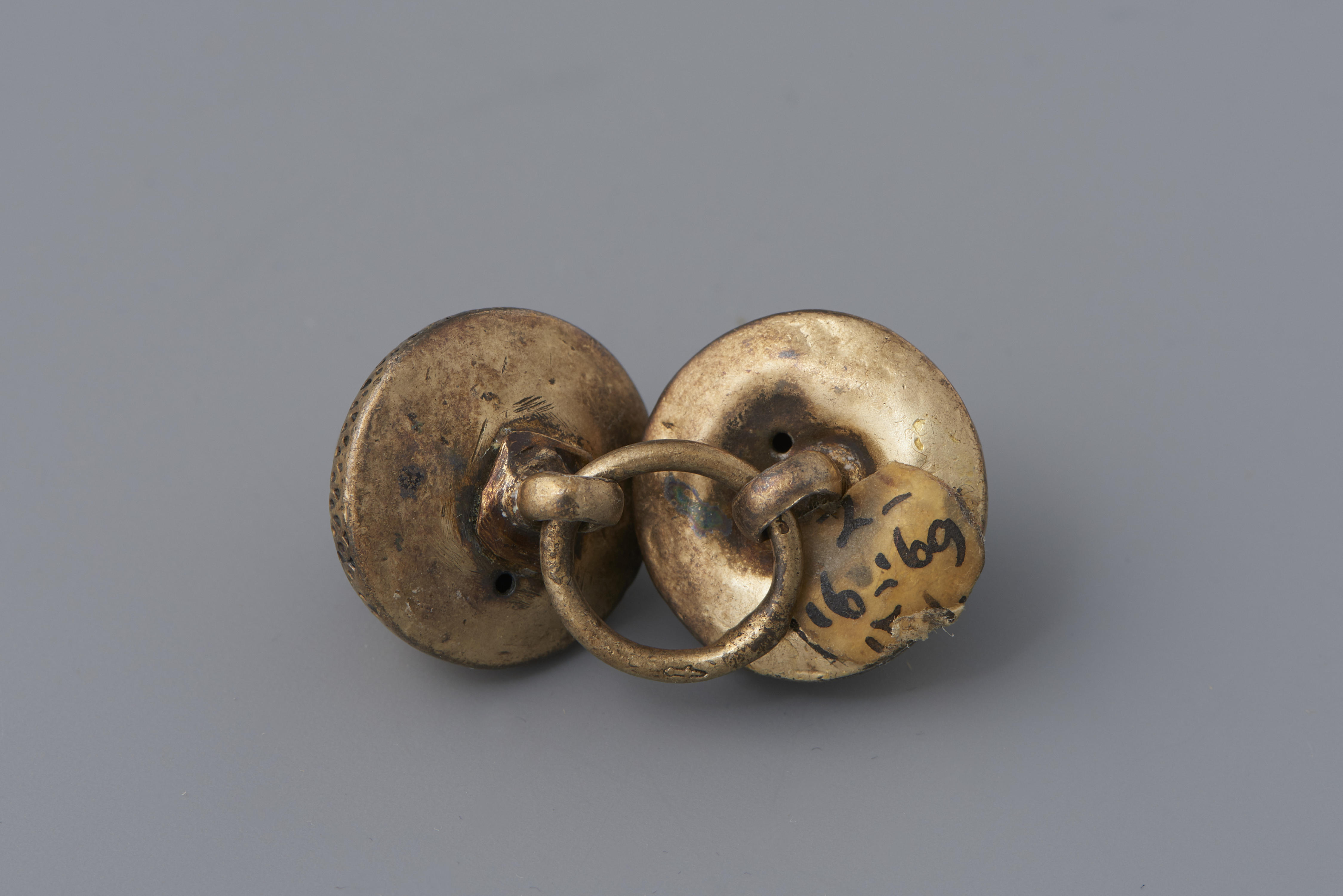 Paar vergulde zilveren keelknopen, Volendam