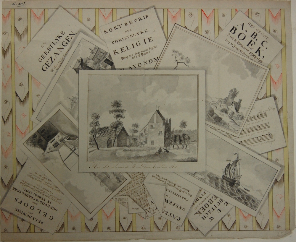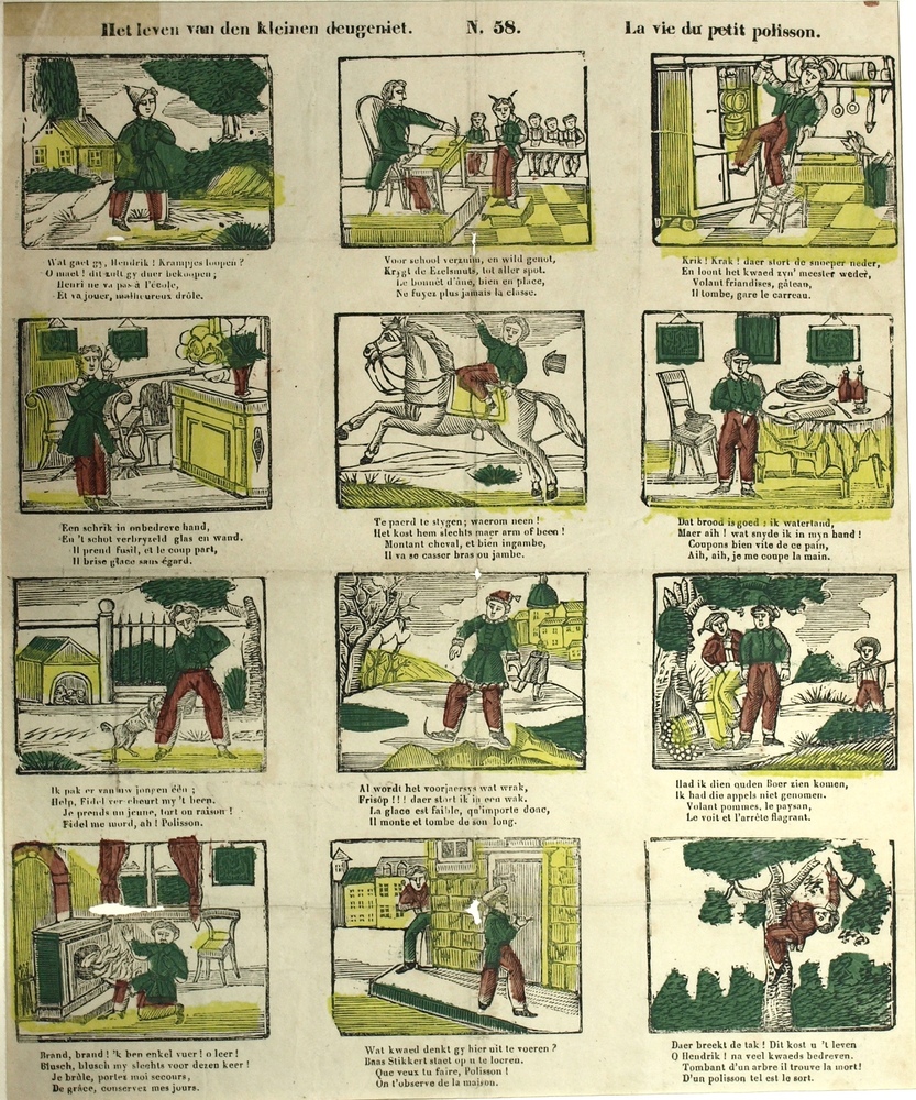 Centsprent met twaalf gekleurde prentjes over het le...