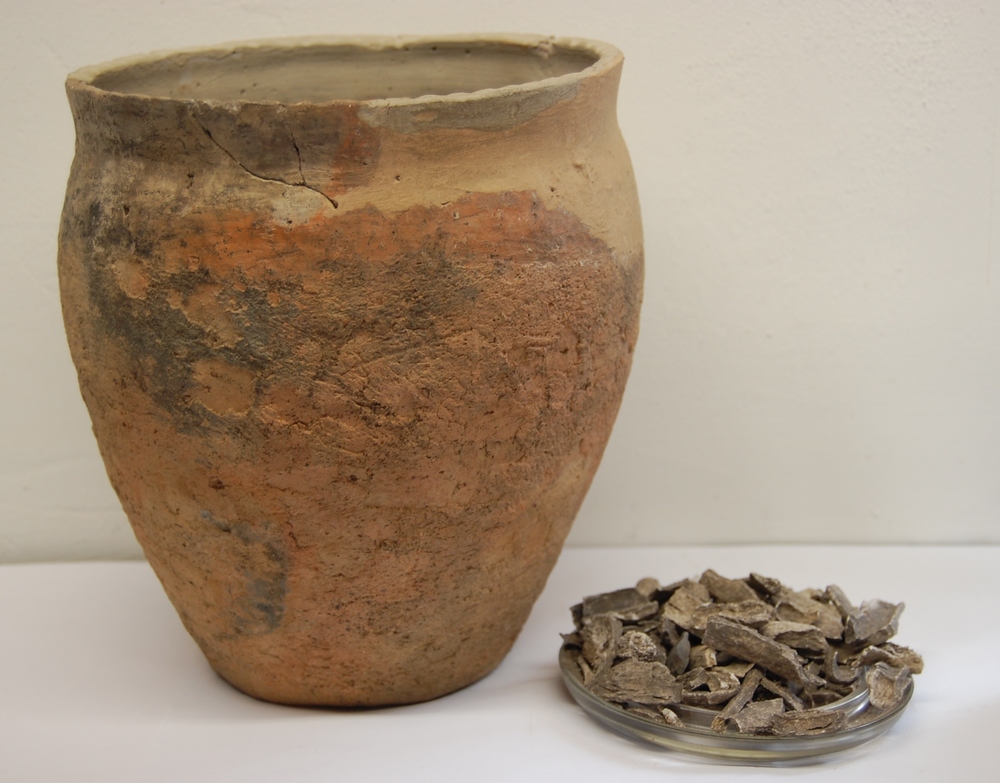 urn van aardewerk en potje met resten van de inhoud,...
