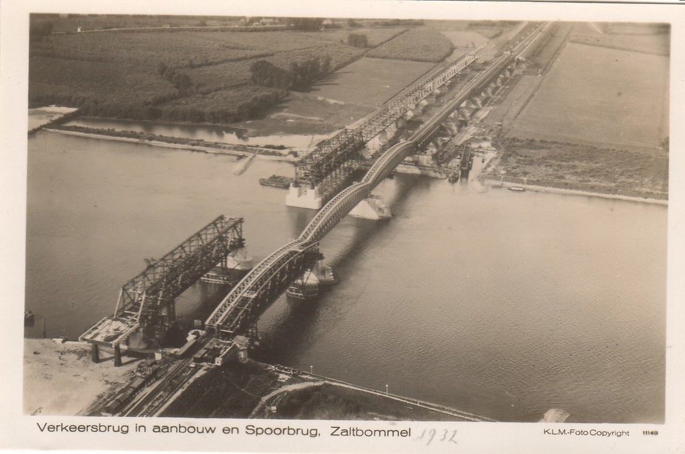 Verkeersbrug in aanbouw en spoorbrug, Zaltbommel.