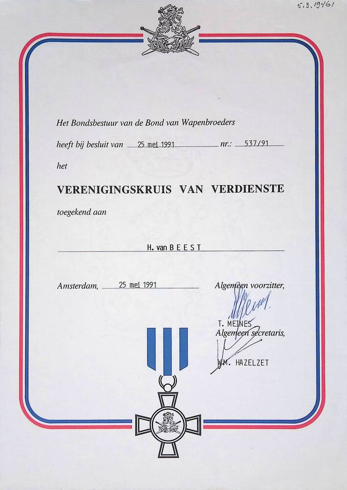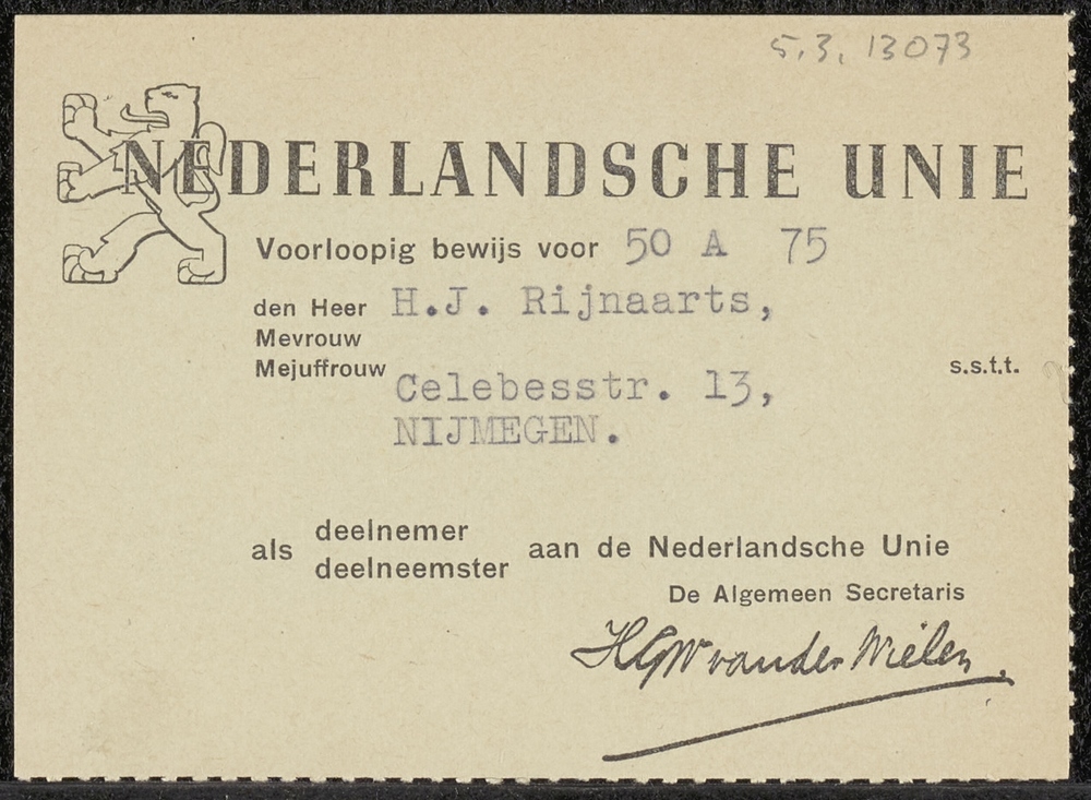 Lidmaatschapsbewijs van de Nederlandsche Unie op naa...