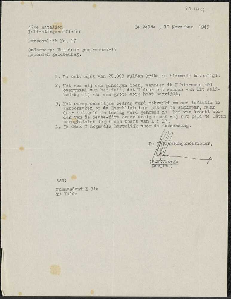 Brief van P.W. Vroege, res. 2e luitenant inlichtinge...