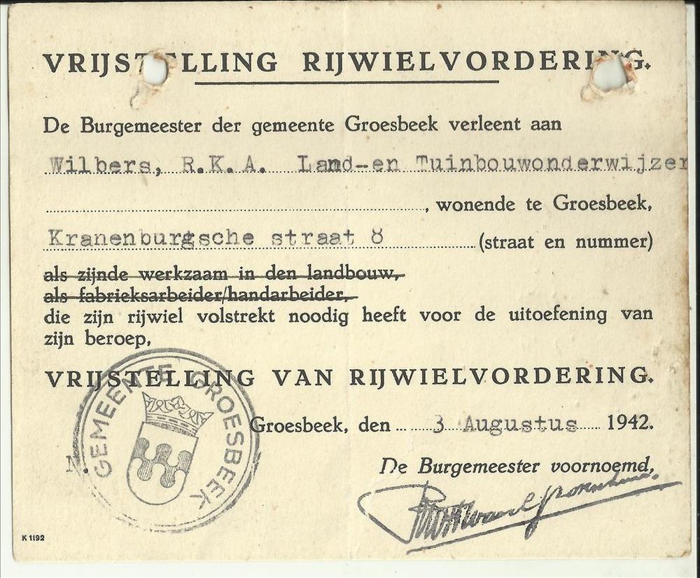 Vrijstelling rijwielvordering, De burgemeester der g...