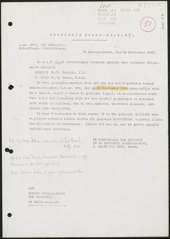 Brief van Provincie Noord-Brabant, 5 september 1945.