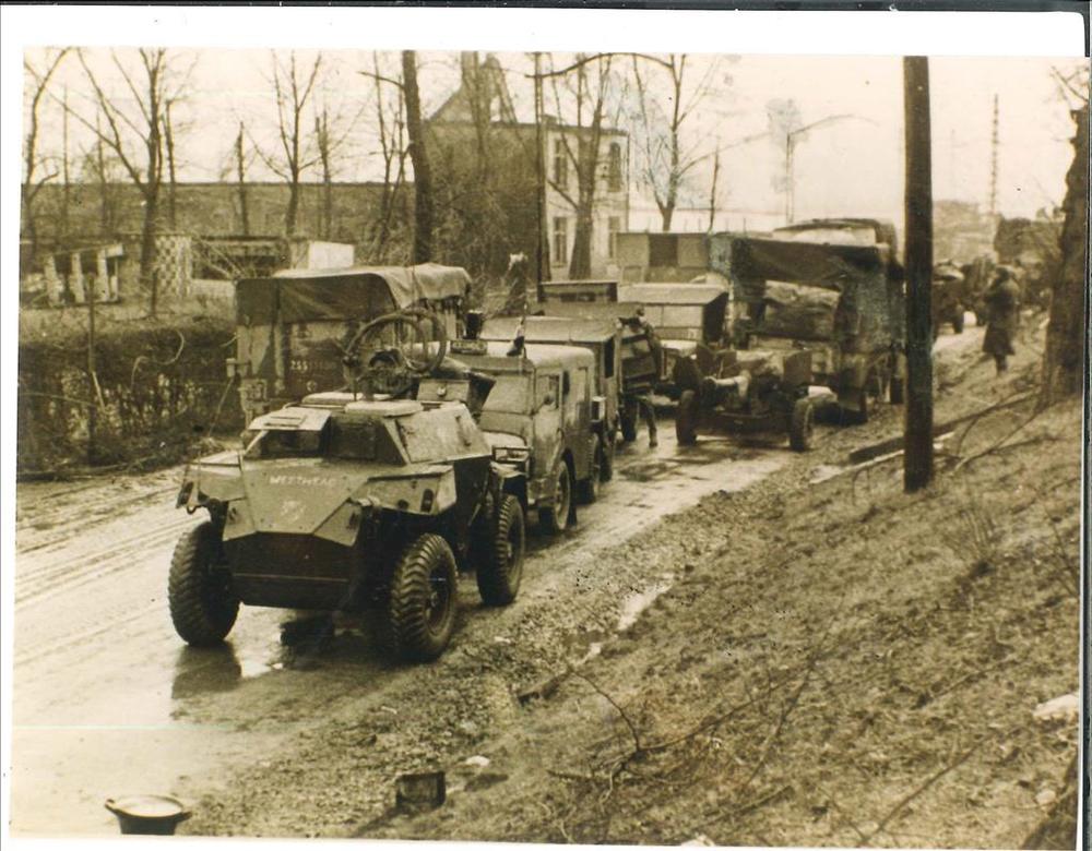 Rij gealieerde voertuigen op de Rijksstraatweg Beek,...