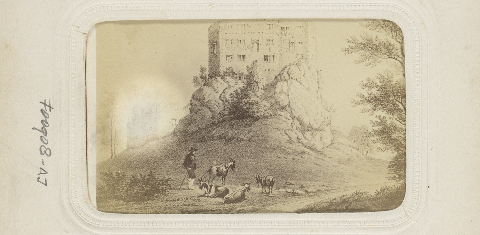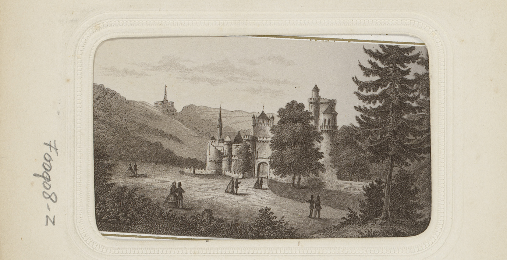 Fotoreproductie van een tekening van een kasteel tus...