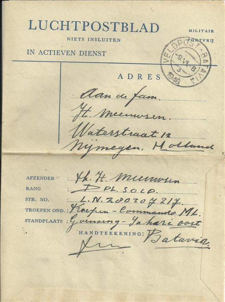 Brief aan de familie Meeuwsen te Nijmegen van de dpl...