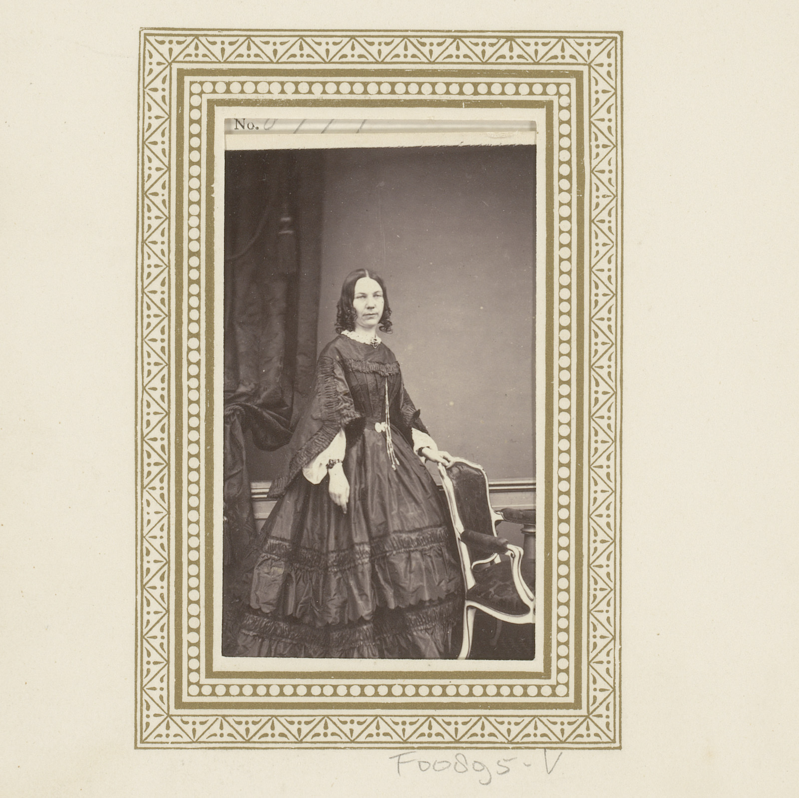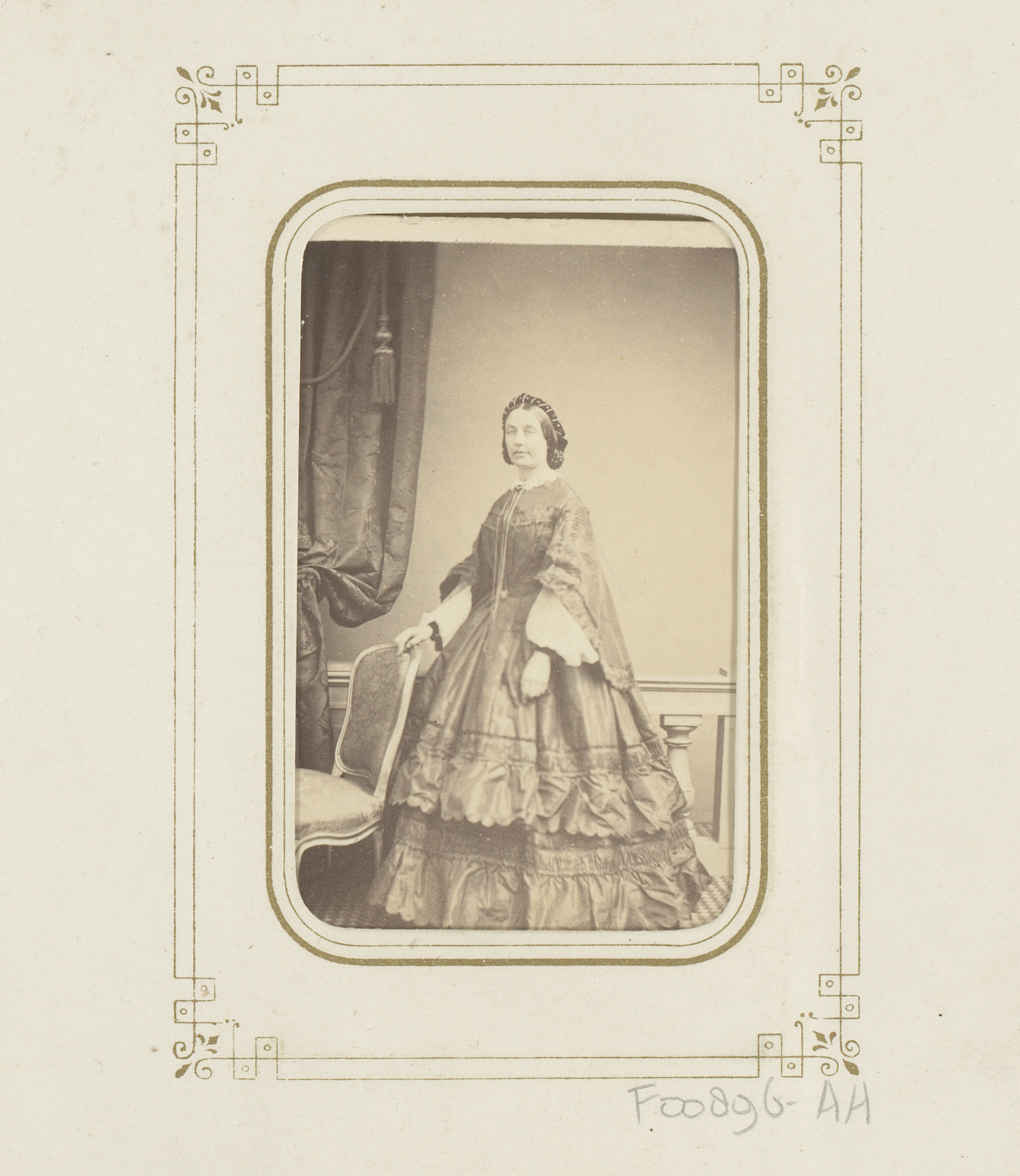 Portret van een vrouw, staand bij een stoel