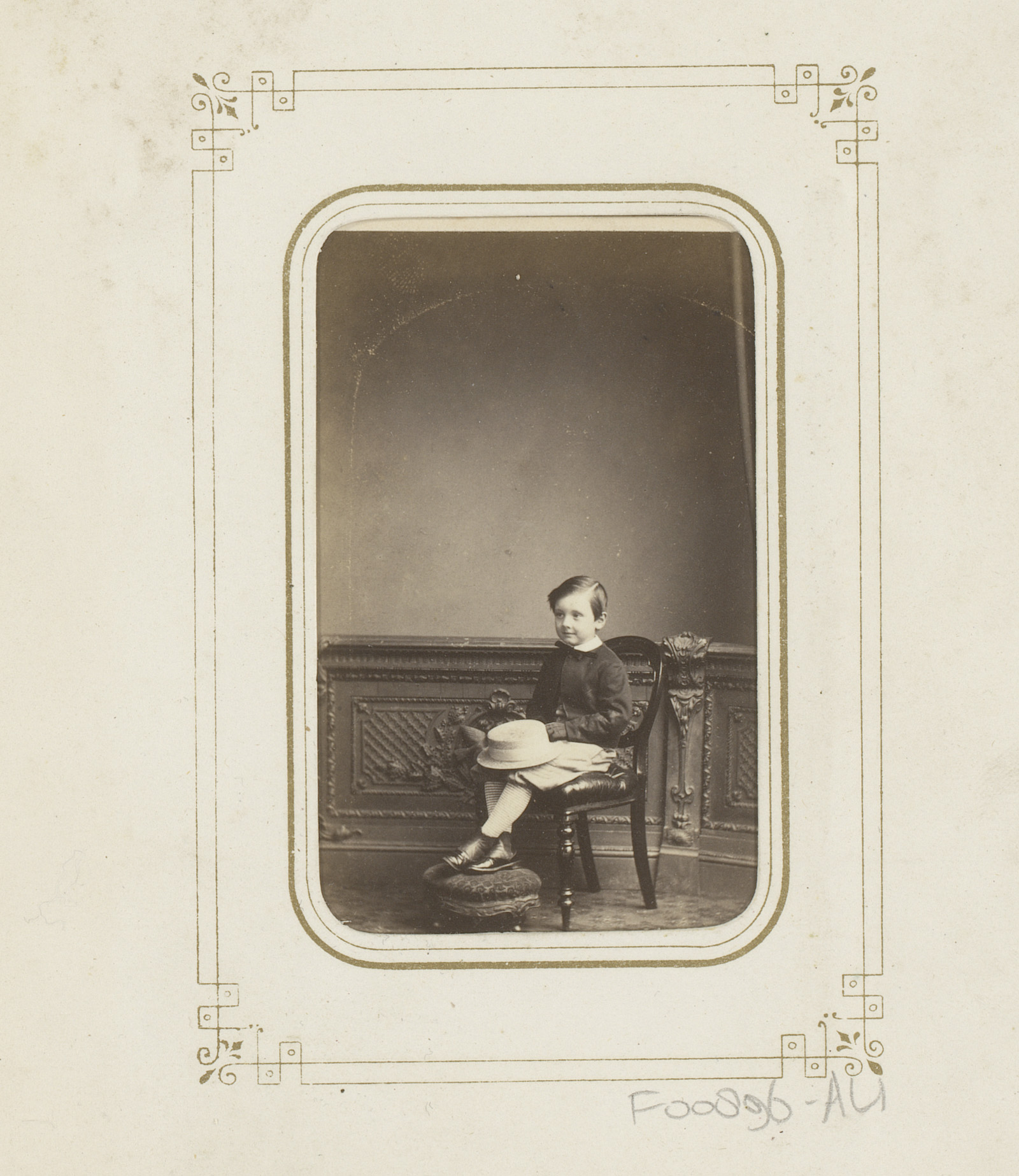 Portret van een jongen met een hoed op schoot