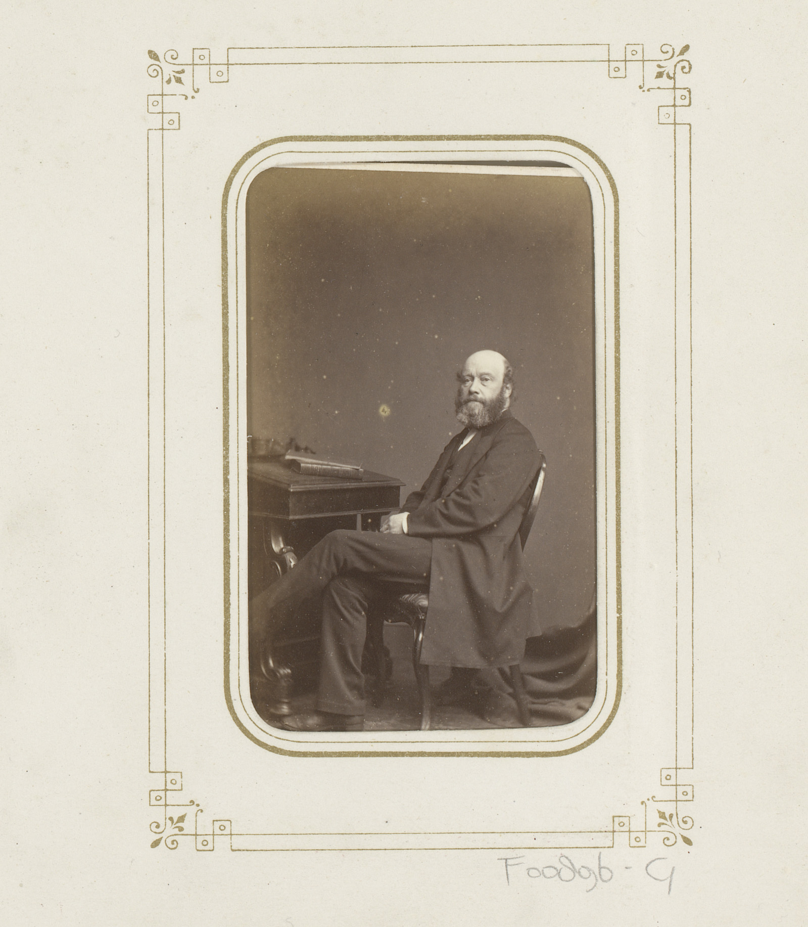 Portret van een zittende man bij een tafel met boeken
