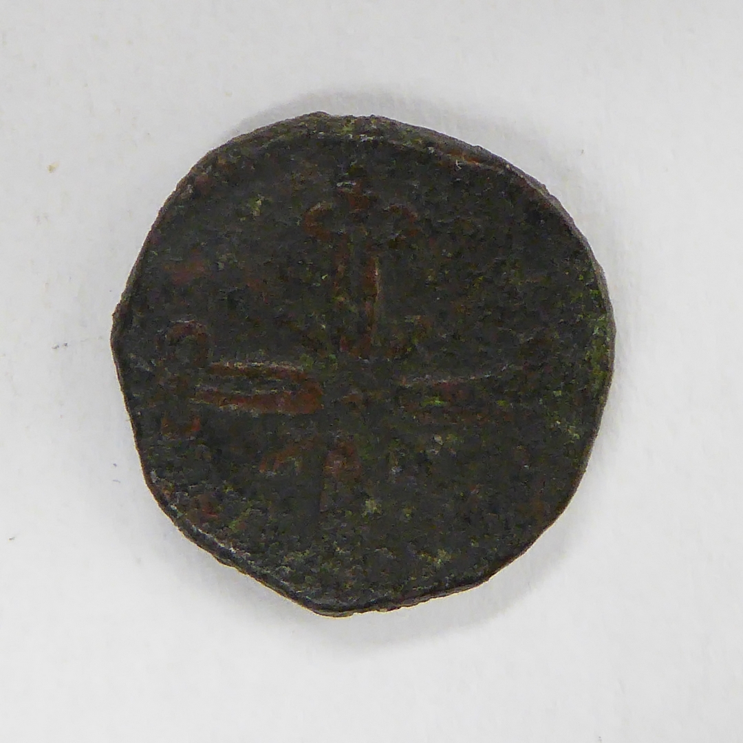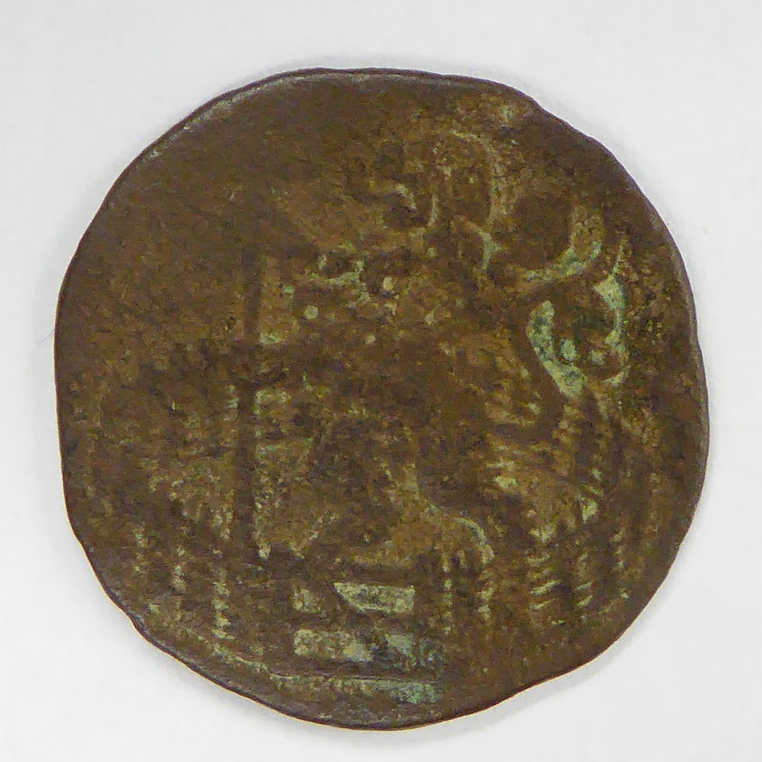 Munt, zeer afgesleten, met mansportret met krullend ...
