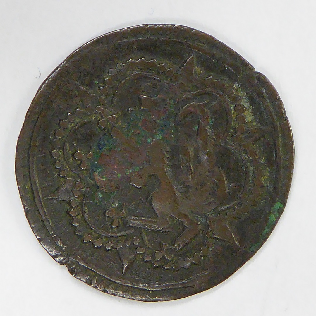 Duit Utrecht met stadswapen gehouden door leeuwen, k...