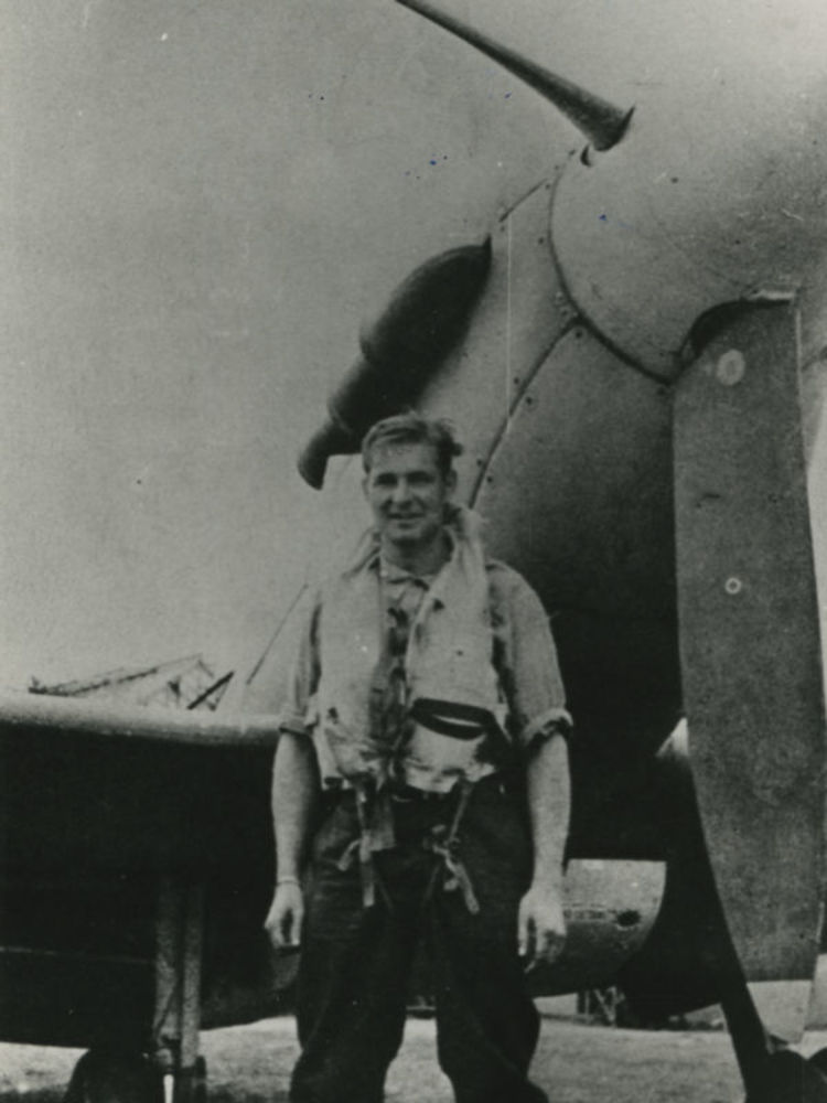 Foto van jonge man in vliegerkledij voor neus Spitfi...
