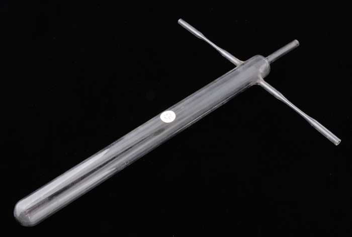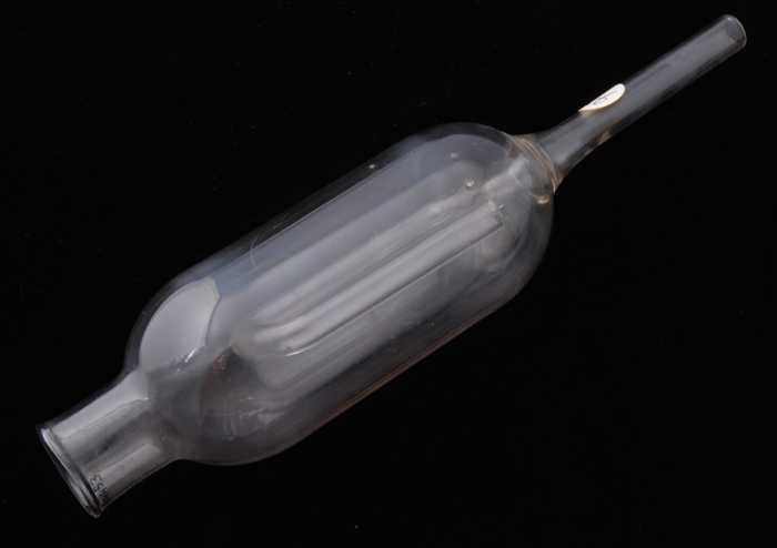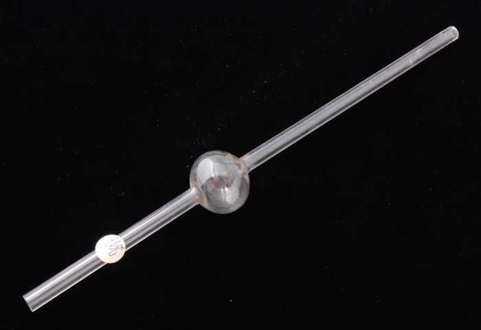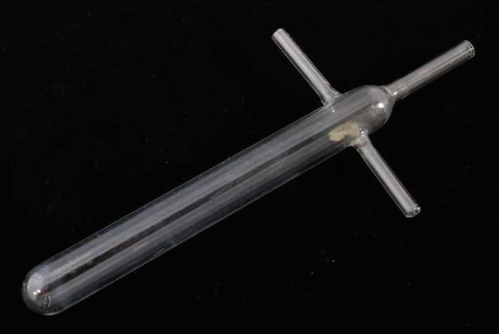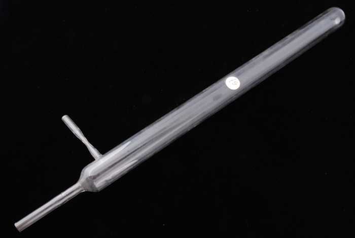 Glazen buis met ronde bodem, lange hals en twee zija...