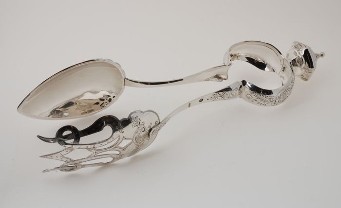 Zilveren saladetang met bloemmotief