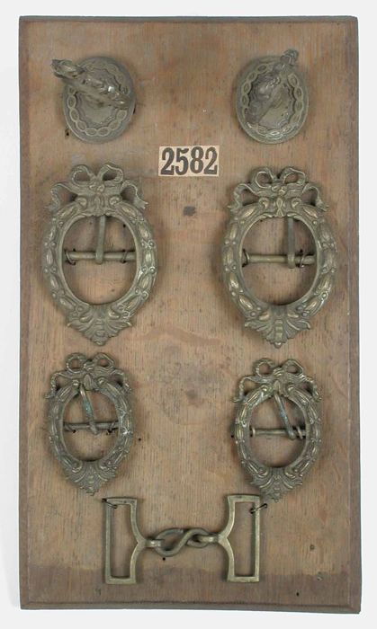 Rechthoekige houten plaat met daarop zeven antieke k...