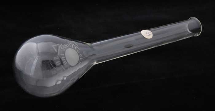 Glazen kolf met ronde bodem en zijarm, gebruikt in a...