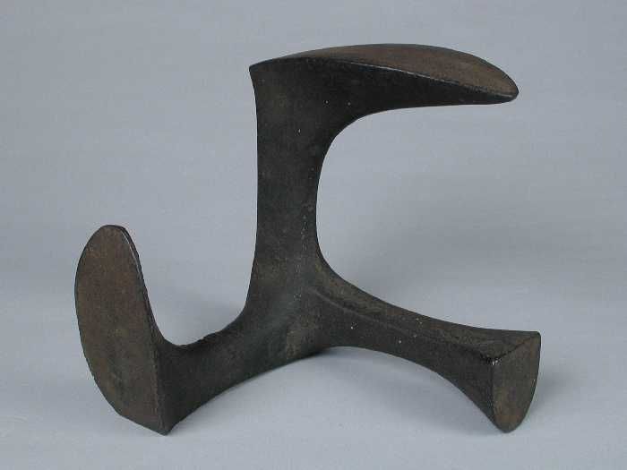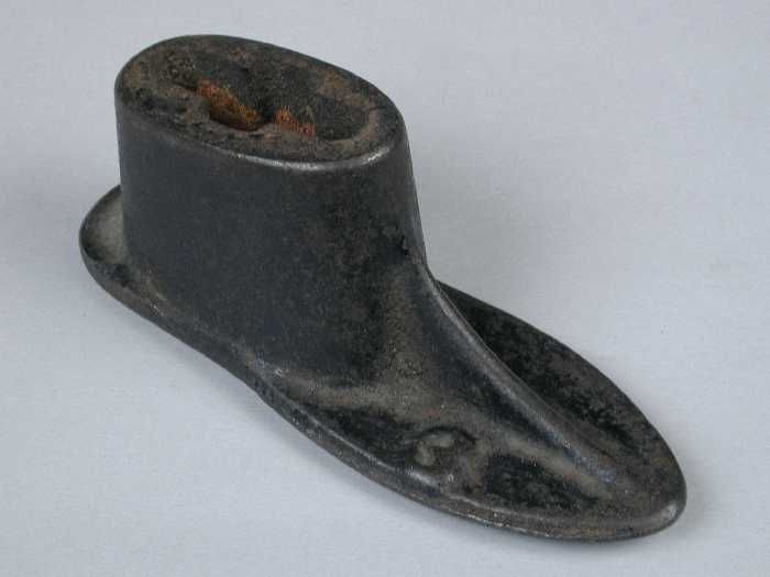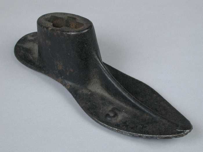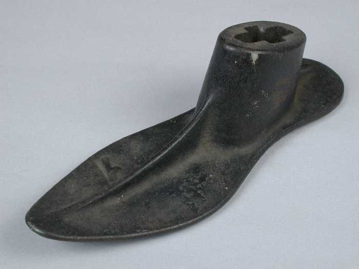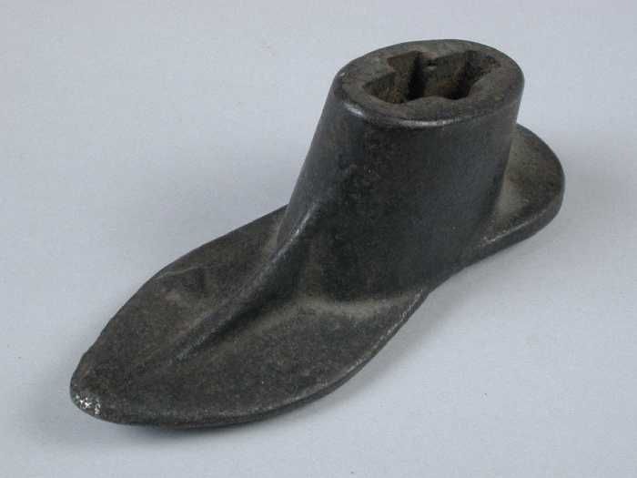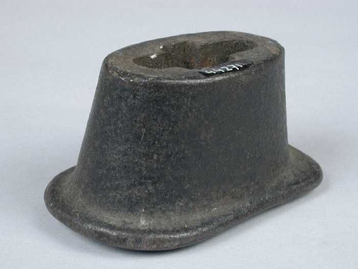 Zware metalen drievoet, met aan elke voet een leest,...