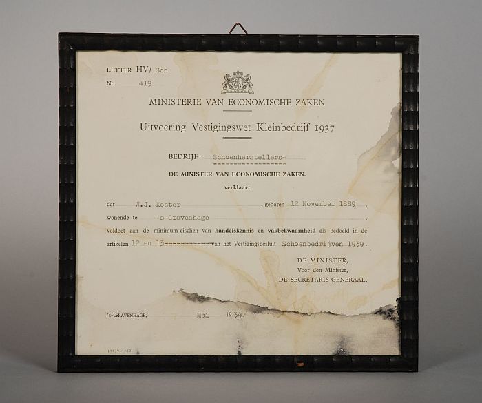 Ingelijste vergunning op naam van schoenmaker Koster...