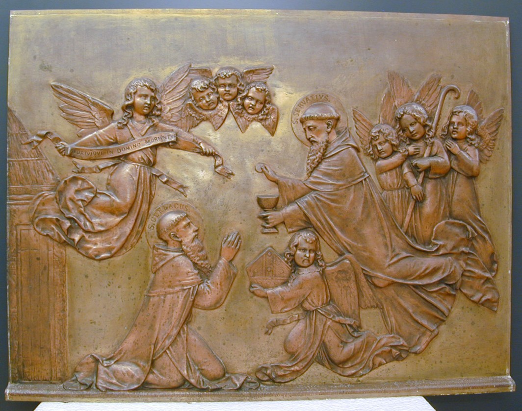 Ampullenblad(?) met op de rand Dominicus en Maria, D...