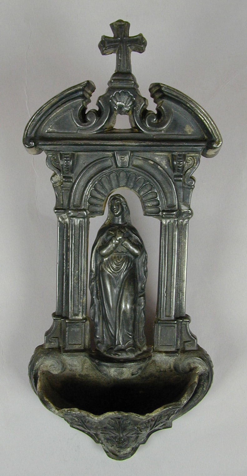 Wijwaterbakje versierd met Maria met kind, op bakje ...