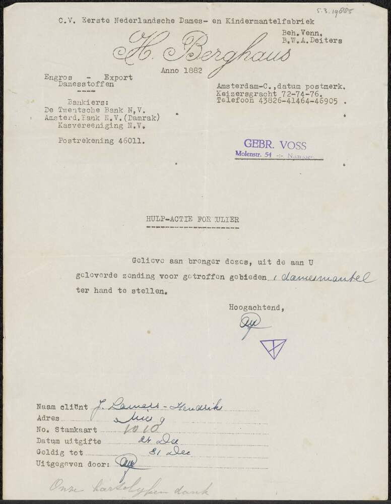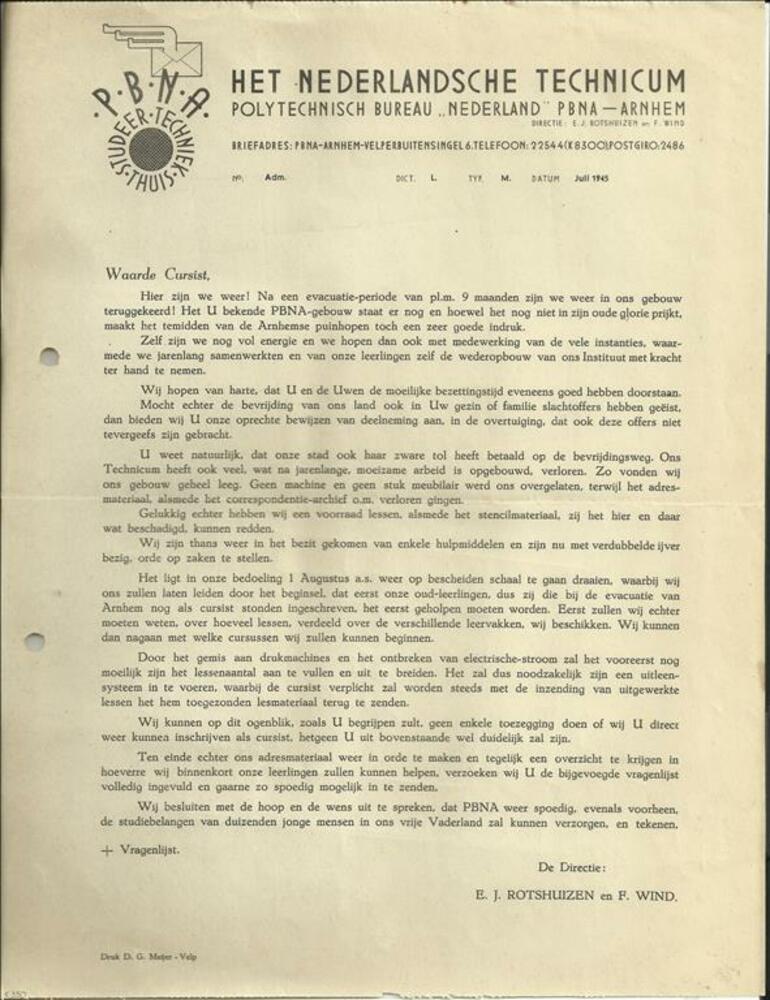PBNA het Nederlandsche Technicum juli 1945, brief vo...