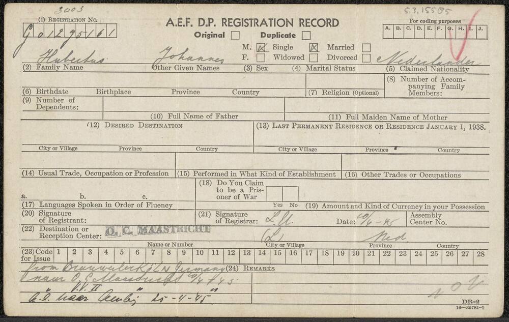 A.E.F. D.P. Registration Record op naam van Johannes...