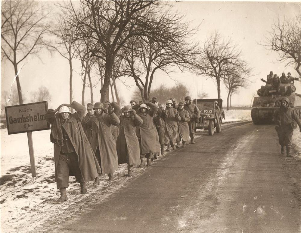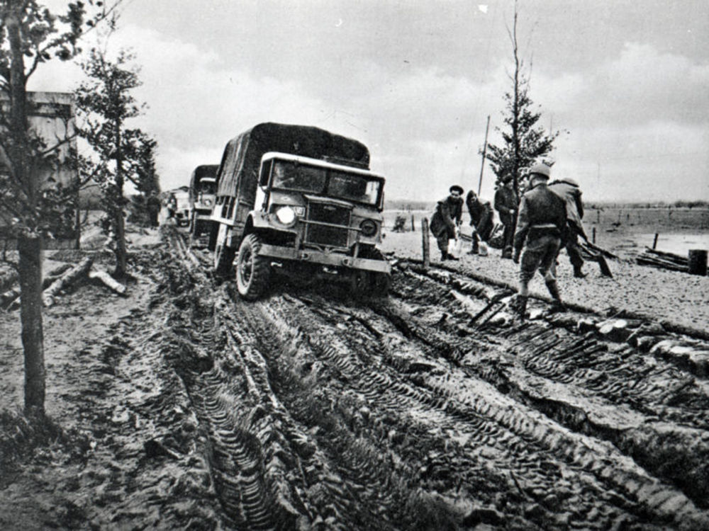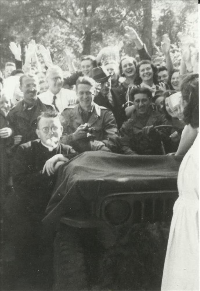 2 Amerikaanse militairen in jeep en juichende burgers
