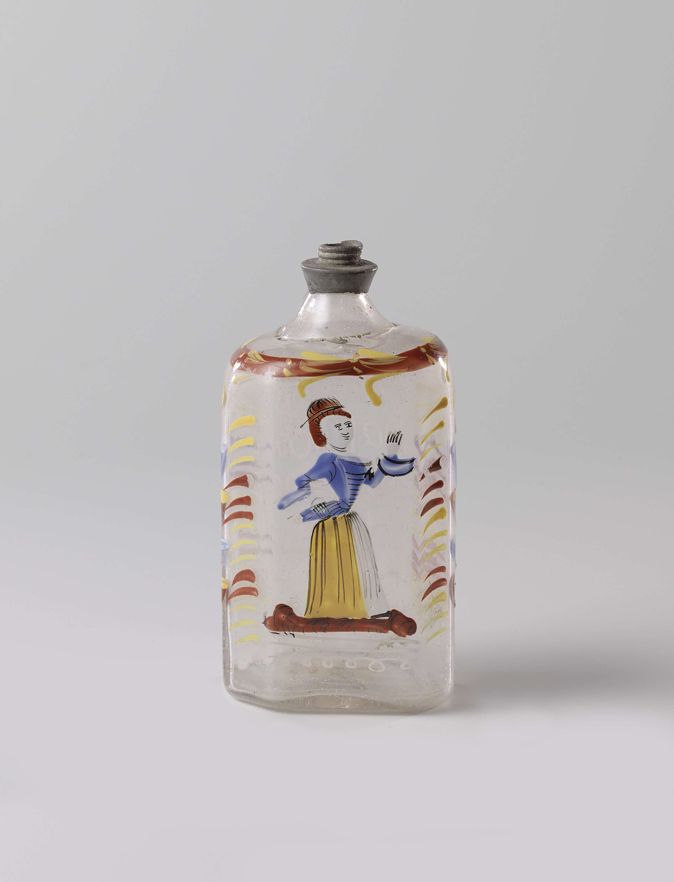 Achtkantige fles met een vrouwenfiguur en het opschr...
