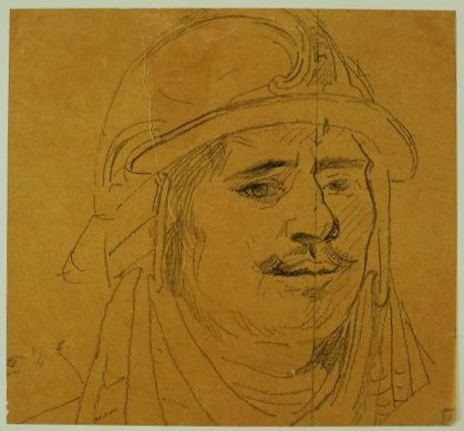 Mannenkop met helm (Naar één van de achterste figure...