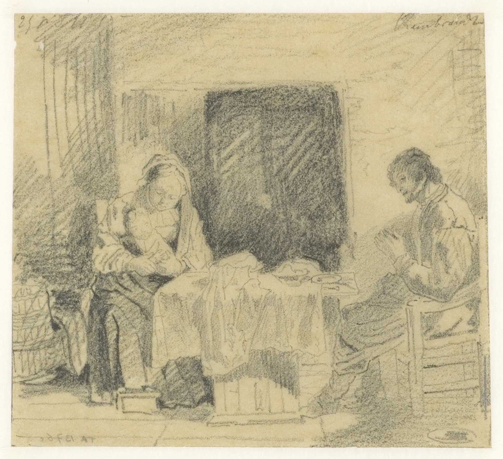 Interieur met zittende man en vrouw met kind aan taf...
