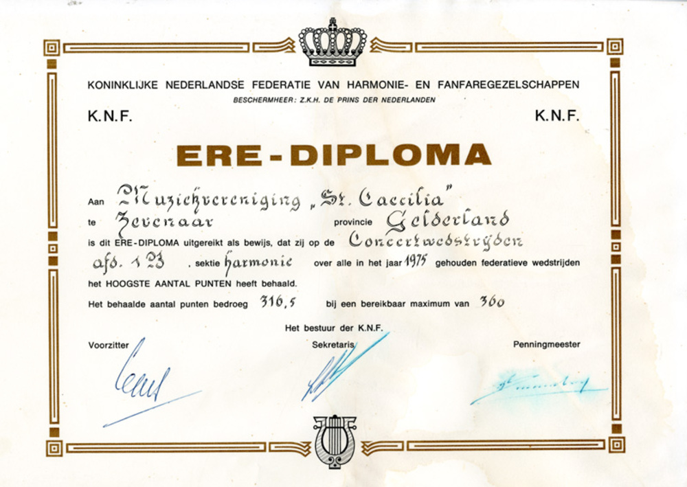 Erediploma voor Muziekvereniging St. Caecilia te Zev...