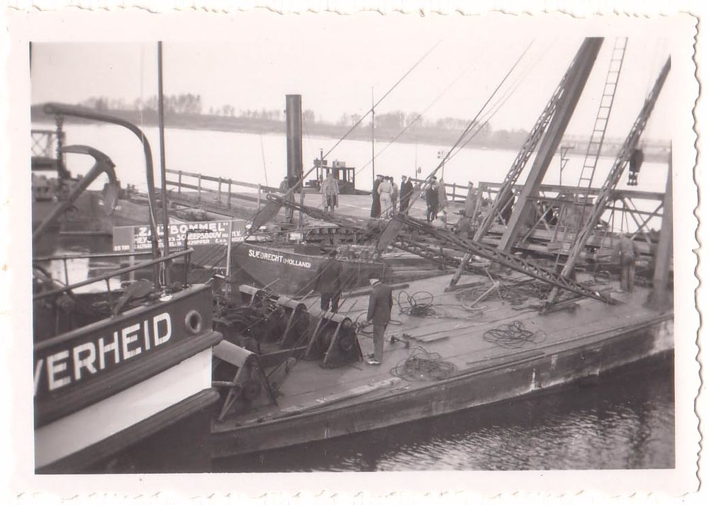 Verwoeste spoorbrug bij Hedel.
