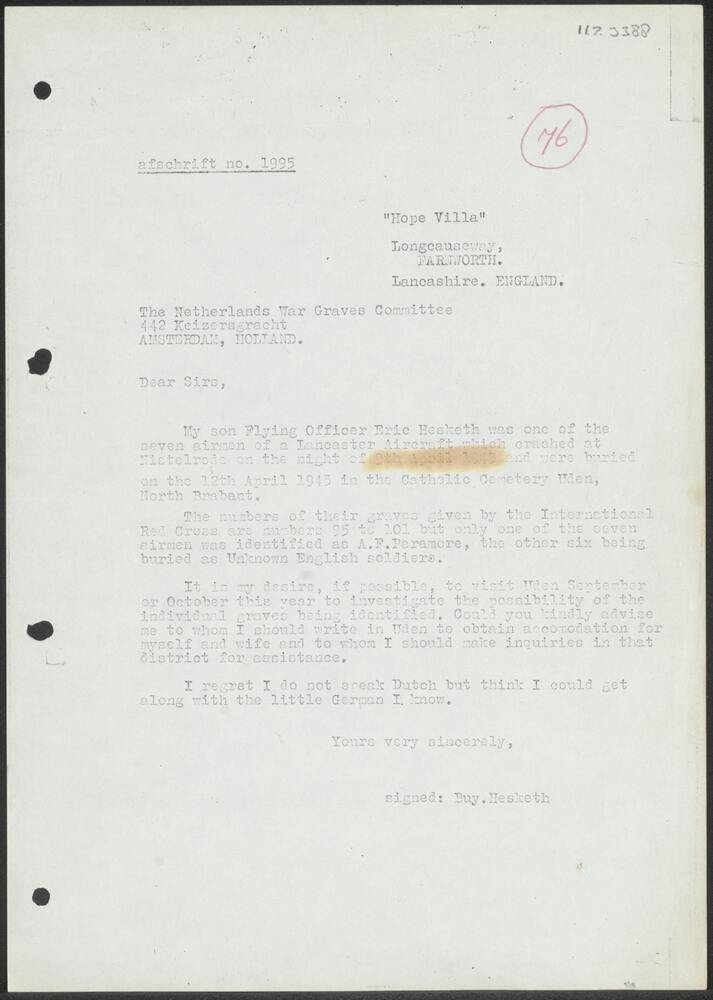 doorslag brief aan Schade Enquête Commissie van B.W....