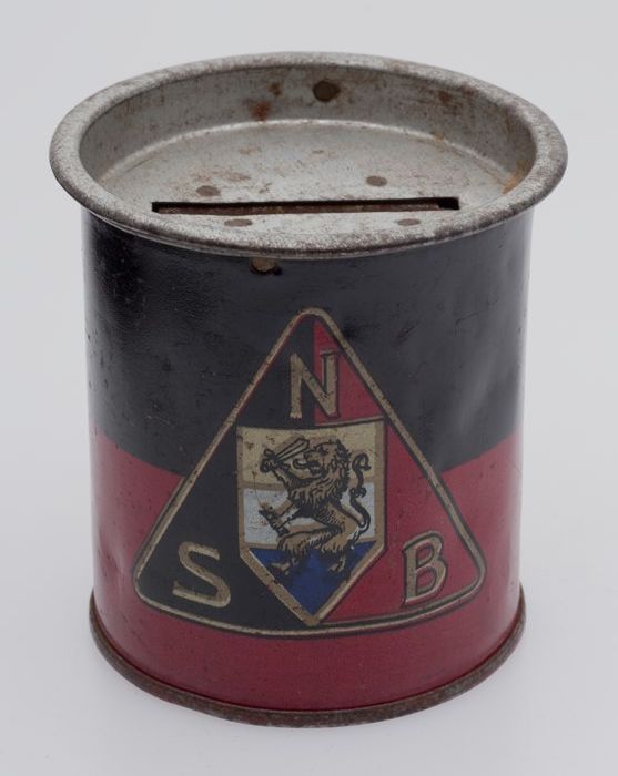 NSB-collectebusje met NSB kleuren en NSB-logo de zij...