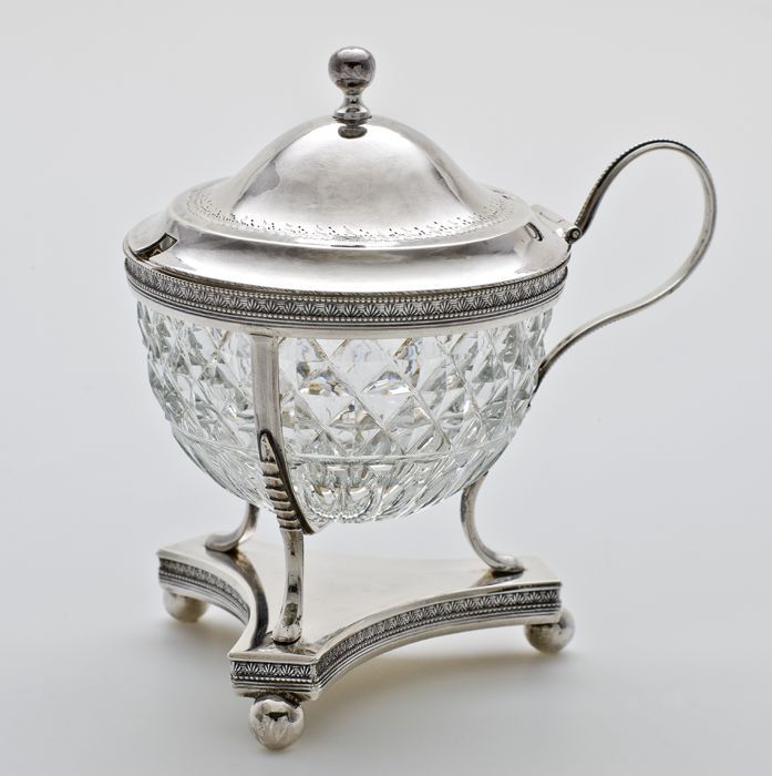 Glazen mosterdpot met zilveren standaard, oor en deksel