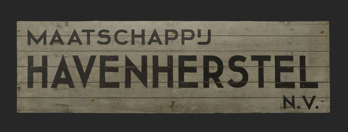 Wit bord met in zwarte letters "MAATSCHAPPIJ / HAVEN...