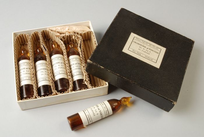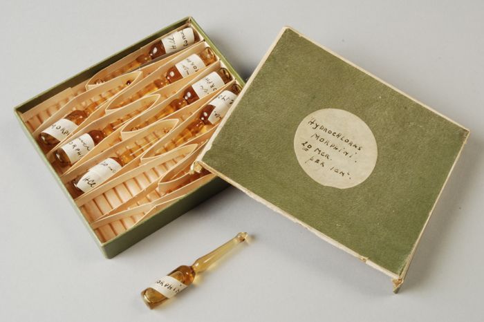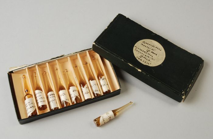 Kartonnen doosje met negen glazen ampullen, elk met ...