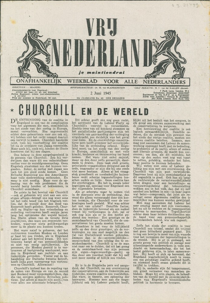 Vrij Nederland, gedrukt te Londen, 5de jaarg. No 45,...