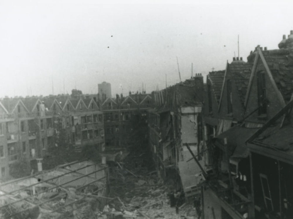 Foto van beschadigde apartementen en schuren na bomi...