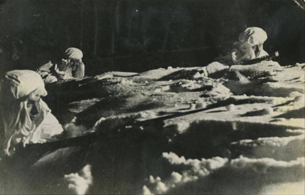 patrouille van 3 mannen in sneeuwkleding tegen donke...