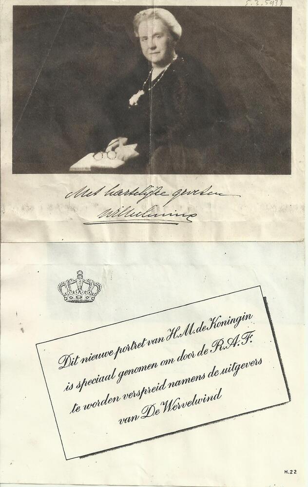 Portret van koningin Wilhelmina met tekst: Met harte...