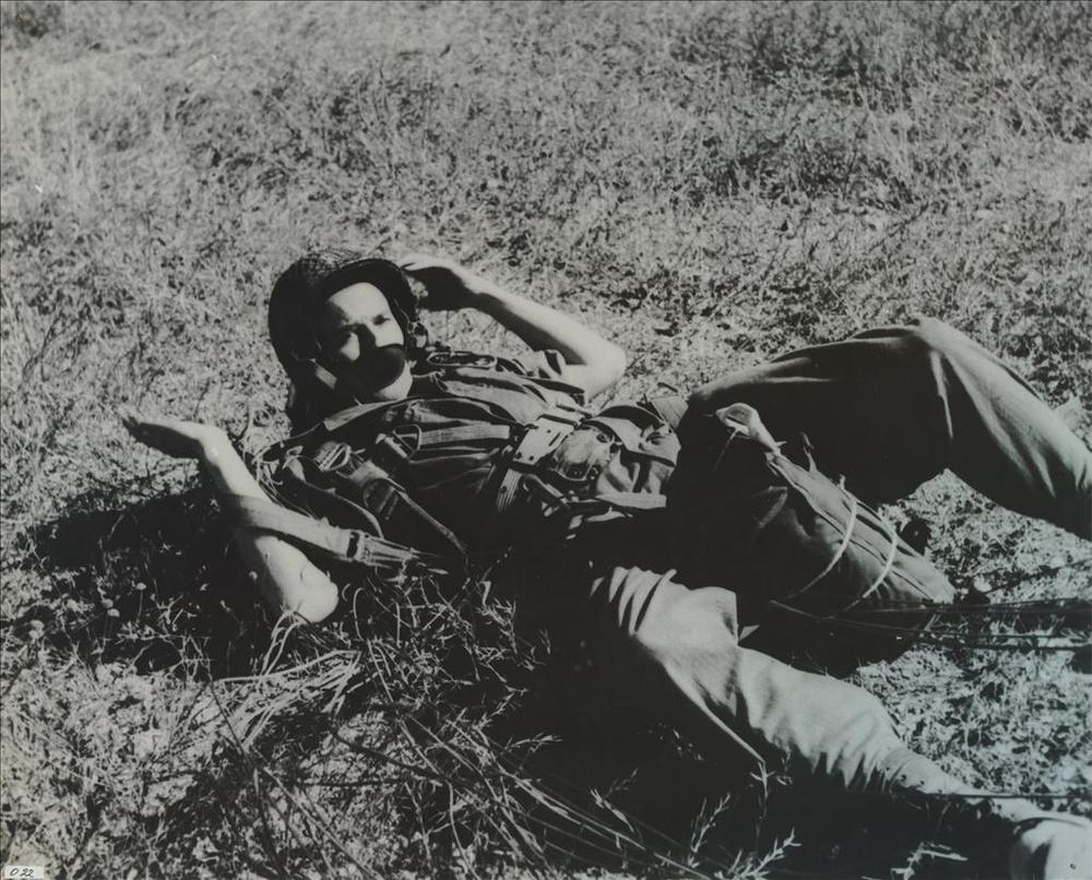 Amerikaanse parachutist kort na landing in weiland