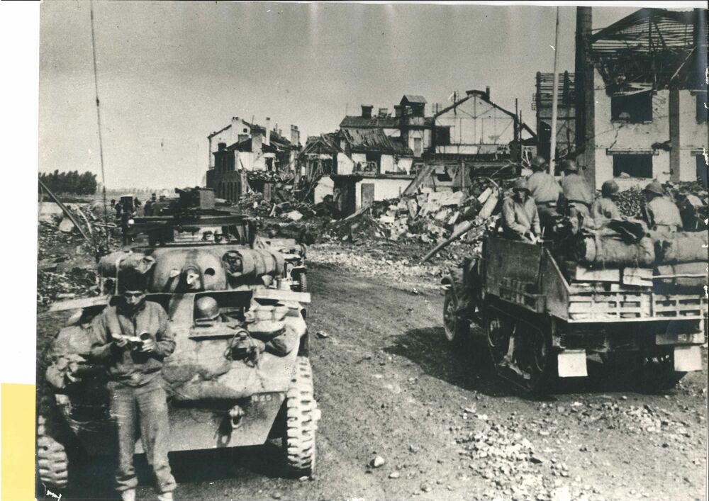 Foto van 2 Amerikaanse half tracks in een verwoeste ...